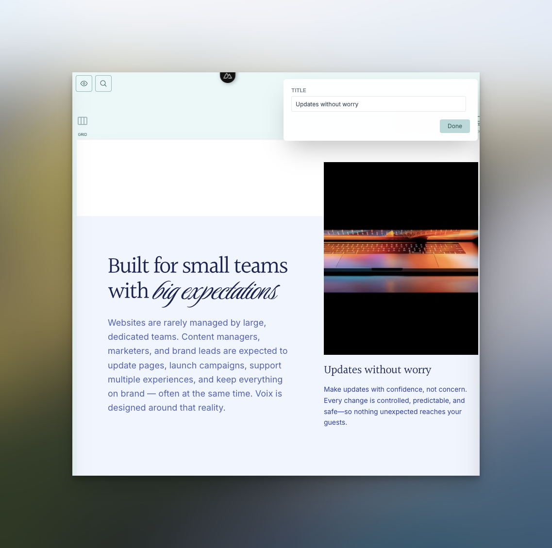 Websites are rarely managed by large, dedicated teams. Content managers, marketers, and brand leads are expected to update pages, launch campaigns, support multiple experiences, and keep everything on brand — often at the same time. Voix is designed around that reality.